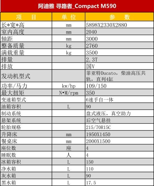 其他描述:阿迪雅寻路者Compact M是一款C型小额头房车,全车尺寸:长5898mmX宽2330mmX高2880mm,可注册蓝牌,C证即可驾驶。 通体流线型结构,非常耐看,符合大多数人的审美眼光。 阿迪雅Compact M,轴距达到了3000mm,整备质量2760kg,满载可至3500kg。乘坐舒适,可装载不少随车物品。优雅的车身,搭配了2.3T柴油发动机,动力可达150马力,最高扭矩350N·m,驾驶时平稳有力。 生活空间---会客区,与驾驶室贯通,正副驾驶座椅均可180度旋转,形成完美的面对面格局,无论是一家人聚在一起说说笑笑,还是商务接待,这个区域都给了我们足够的空间。宽大的会客区,最少也能容纳6人同时落座,而且并不觉拥挤。 座椅边缘凸起,很好的衬托腿部,坐起来更加舒服。真皮座椅,清洁起来省时省力。 阿迪雅Compact M整体卫浴,空间相对比较充裕。 塞特福德的固定式电动冲水马桶,搭配一个17.8L容量的行李箱式黑水箱,适时排放。为旅途生活带来极大的便利。 多功能镜面储物壁柜设计的十分巧妙。打开上面2扇玻璃门,是可以摆放牙膏牙具的三层隔板,既保证收纳整齐,又很方便取用,就像在家里一样,很是方便。